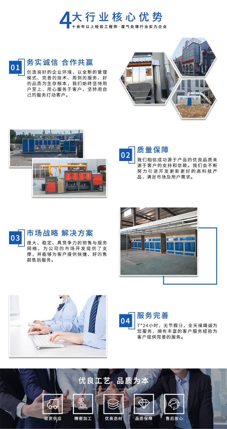 公司自成立以來,始終專注于工業(yè)廢氣、污水、粉塵等環(huán)境污染的治理,先后研發(fā)出催化燃燒設(shè)備、光氧催化廢氣處理設(shè)備、低溫等離子廢氣處理設(shè)備、粉塵處理-體化設(shè)備等一系列環(huán)保設(shè)備,產(chǎn)品先后通過ISO901質(zhì)量管理體系認(rèn)證、中國環(huán)境保護(hù)產(chǎn)品認(rèn)證。